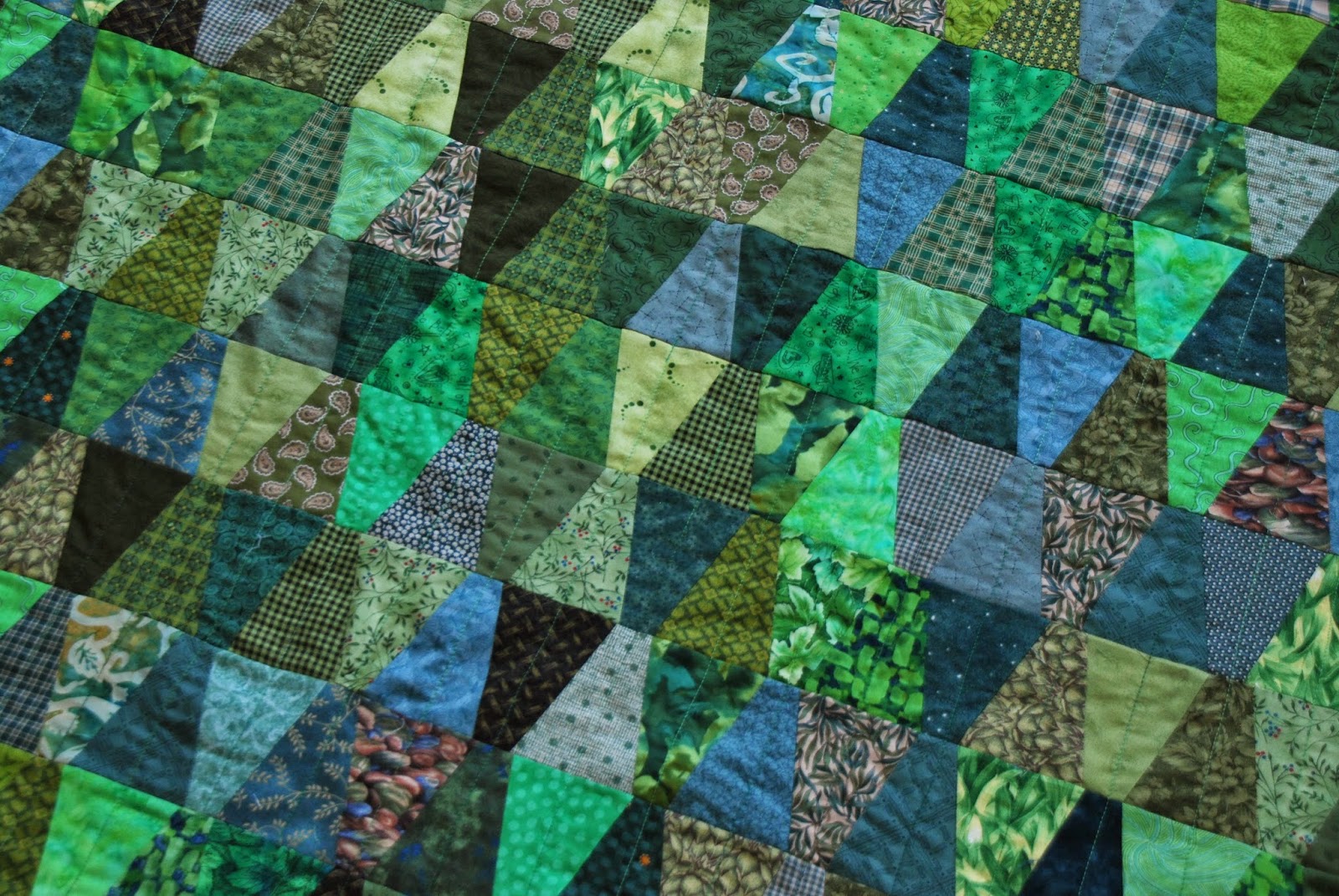 Det er mange forskjellige grønnfarger i dette teppet, fifty shades of green, minst, og mange av stoffene er fra tidlig nittitall, nostalgi, med andre ord.