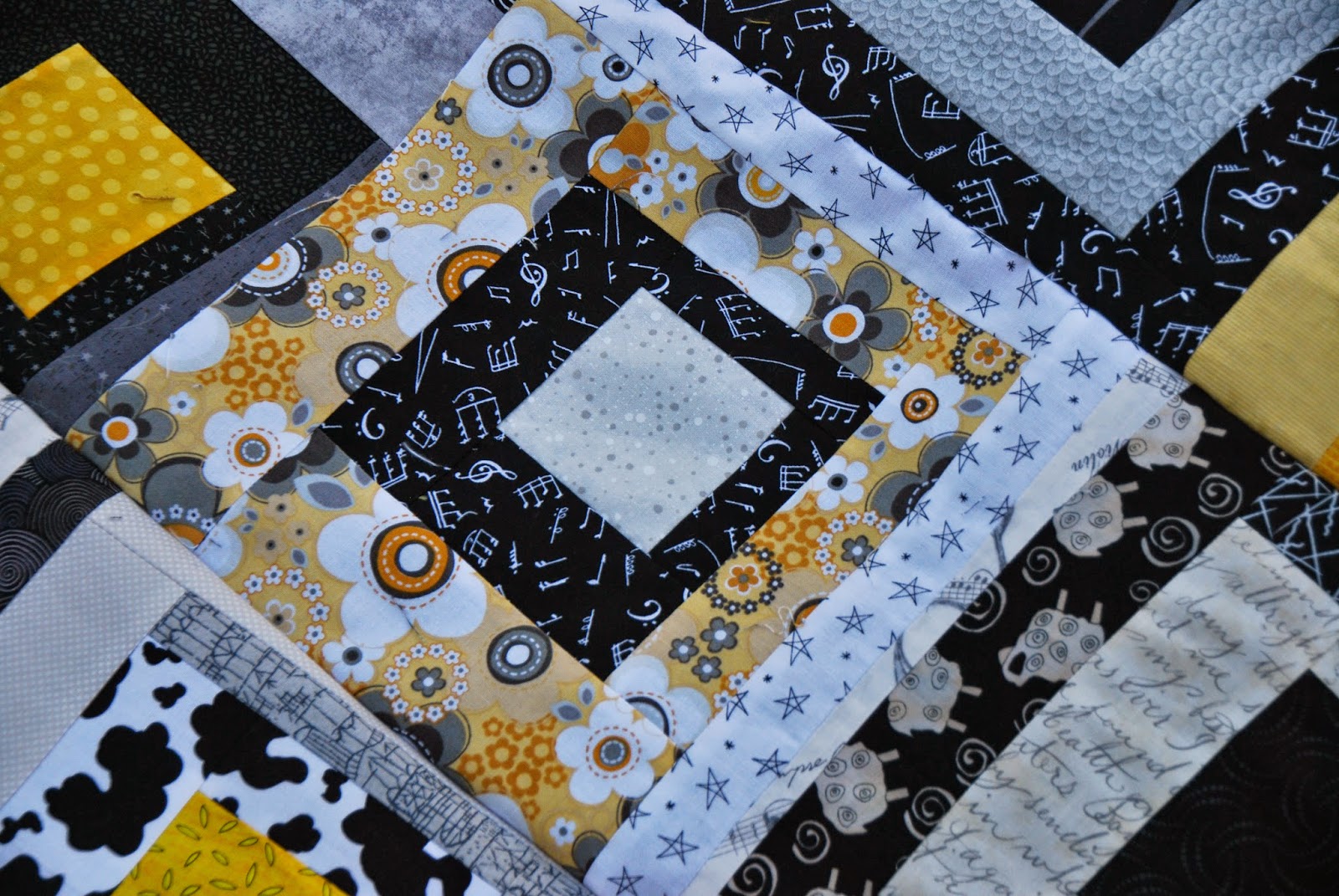 Etter å ha sortert alle restene mine i brødposer, fant jeg på at jeg skulle sy et dobbelt sengeteppe. Jeg liker å gå utenom "rammene", og ville bruke opp noen kvadrater som hadde ulik størrelse, så jeg begynte bare å sy rundt og rundt som om det var en vanlig log cabin, mer eller mindre uten mål og mening. Jeg skar rutene til med den linjalen som er 9,5 x 9,5 inch. Underveis fant jeg på å skjære noen av rutene skjevt i ekte "wonky log cabin"-stil. Disse spredte jeg jevnt utover teppet. Der er altså ingen riktig skjeve ved siden av hverandre. Jeg ville ikke at noe skulle stemme, så jeg vred rutene rundt slik at firkanten i midten ikke ble liggende på rekke. Som dere ser har noen av stoffene stort mønster. Dette skaper liv i teppet.